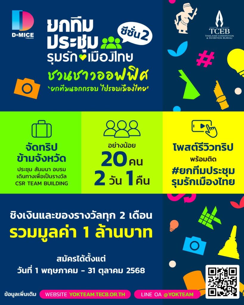 แคมเปญนี้ มีระยะเวลาการสมัครเข้าร่วมโครงการ ตั้งแต่วันนี้ – 31 ตุลาคม 2568 โดยแบ่งผลงานที่ส่งเข้าประกวดเพื่อตัดสินผู้ชนะรางวัลเป็น 3 ช่วง ได้แก่ ช่วงที่ 1 ตั้งแต่วันนี้ – 30 มิถุนายน 2568 ช่วงที่ 2 วันที่ 1 กรกฎาคม – 31 สิงหาคม 2568 และช่วงที่ 3 วันที่ 1 กันยายน – 31 ตุลาคม 2568 โดยกรอกรายละเอียดได้ที่ yokteam.tceb.or.th กดเพิ่มเพื่อนกับ LINE Official Account @yokteam และติดตาม FB Fanpage : TCEB Domestic MICE เพื่อติดตามข่าวสารของแคมเปญ รวมถึงผลการประกวด
